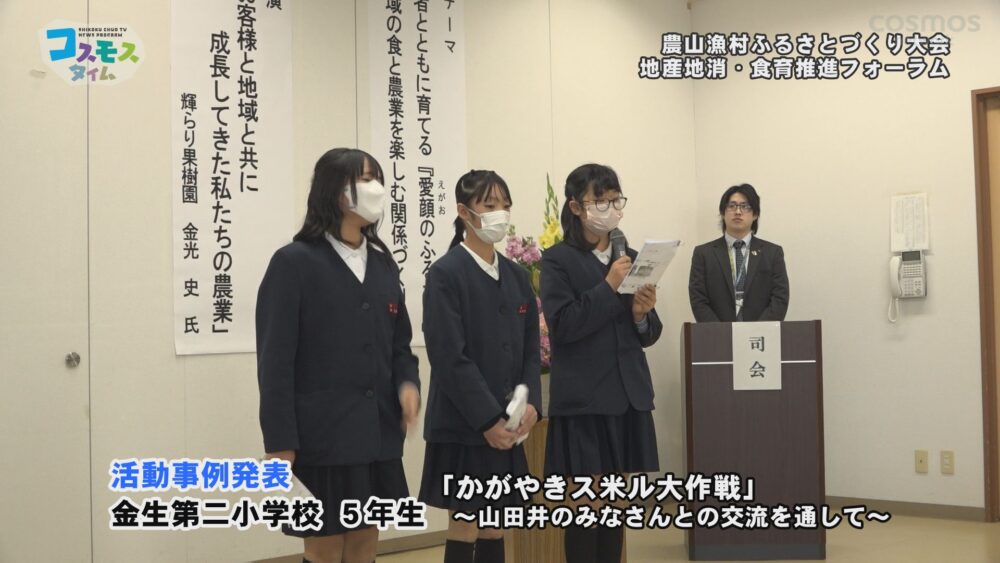 活動事例発表では金生第二小学校の5年生3人が地域住民の協力を得て2025年度に挑戦した米作りの工程を発表。