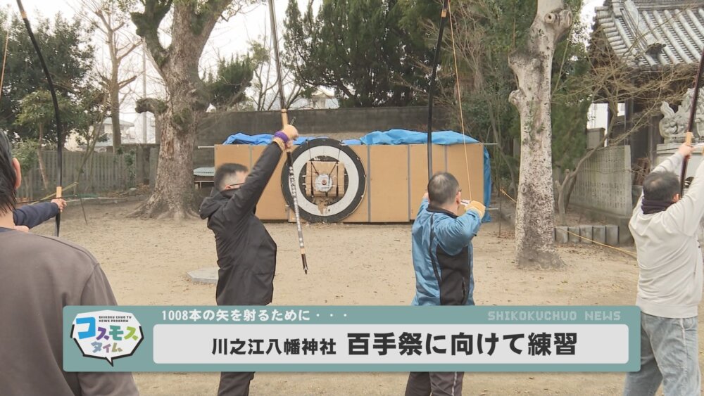 最新番組情報できたて!番組内容等ご確認ください! 川之江八幡神社 百手祭りに向けて練習 3月21日(土)17:15~ Eventぽけっと 川之江八幡神社で、百手祭りに向けた練習が行われました✨ 百手祭りは、1008本の矢を放ち、家内安全・無病息災を願う川之江八幡神社の伝統行事です🏹 川之江町内25区が毎年持ち回りで行っており、今年は農人町の担当。この日は、30人近くの人が集まり、練習に励んでいました。 場所:川之江八幡神社