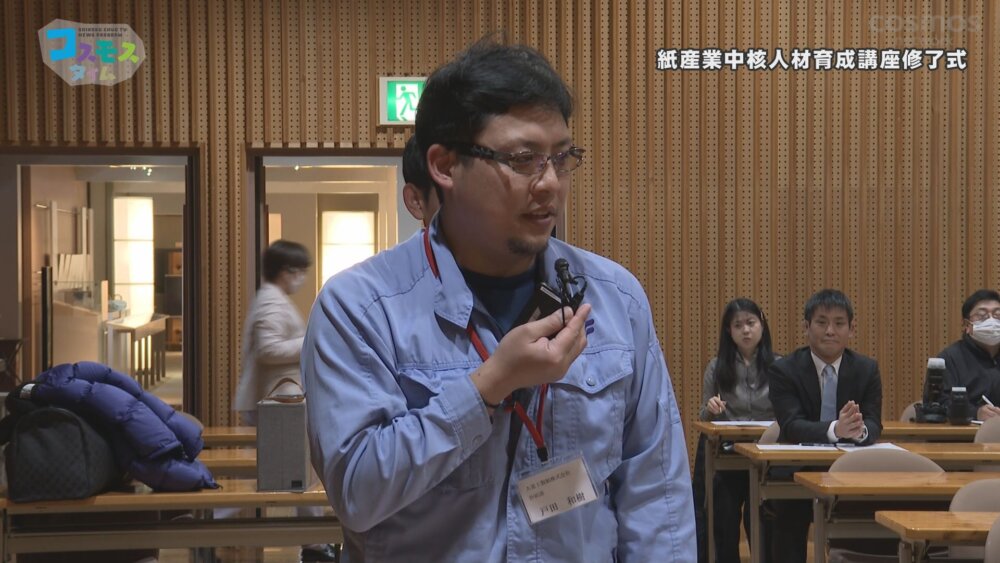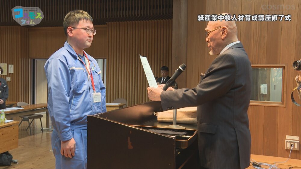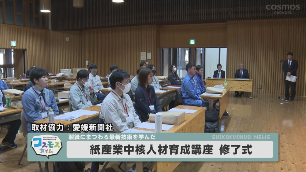 最新番組情報できたて!番組内容等ご確認ください! 紙産業中核人材育成講座修了式 3月29日(日)22:00~ イベントノーカット番組 紙産業の将来をリードする人材を育成する愛媛県紙パルプ工業会の紙産業中核人材育成講座修了式が愛媛県紙産業技術センターであり、およそ9か月間のカリキュラムを終えた受講生が修了証書を受け取りました 愛媛県紙パルプ工業会が2005年から「紙加工」「製紙」の2コースを1年交代で開講しており、これまでに延べ288人が受講しました。 場所:愛媛県紙産業技術センター