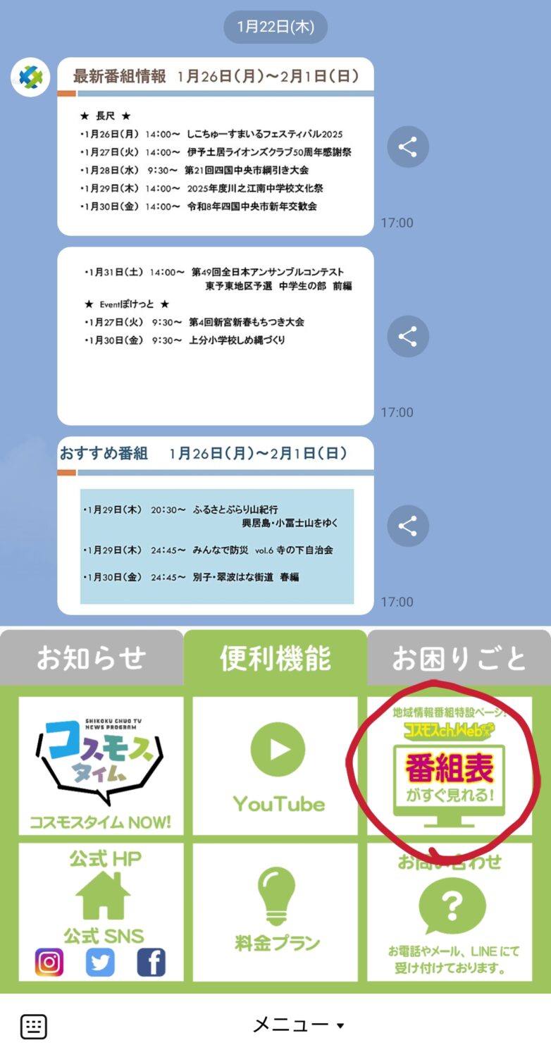 現在番組表は紙媒体でのお渡しがないのですが、HPで番組表をご確認頂けます。しかし毎回HPを開くのは手間・・・という方にはコスモスネットワークのLINEをお勧めいたします!LINEのメッセージ画面から「番組表」を押すとワンタッチで番組表が表示できますし、おすすめ番組もLINEでお知らせ致します。