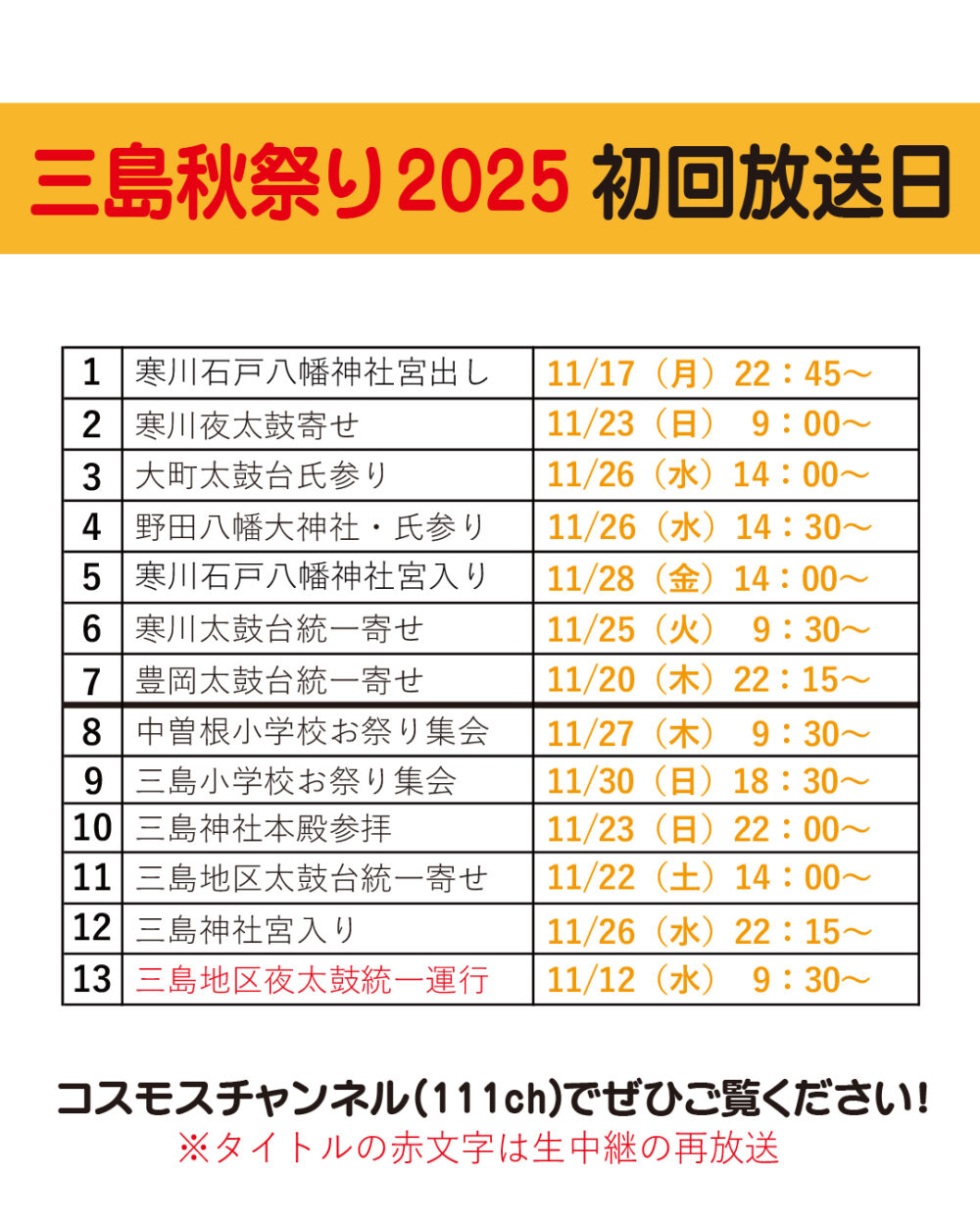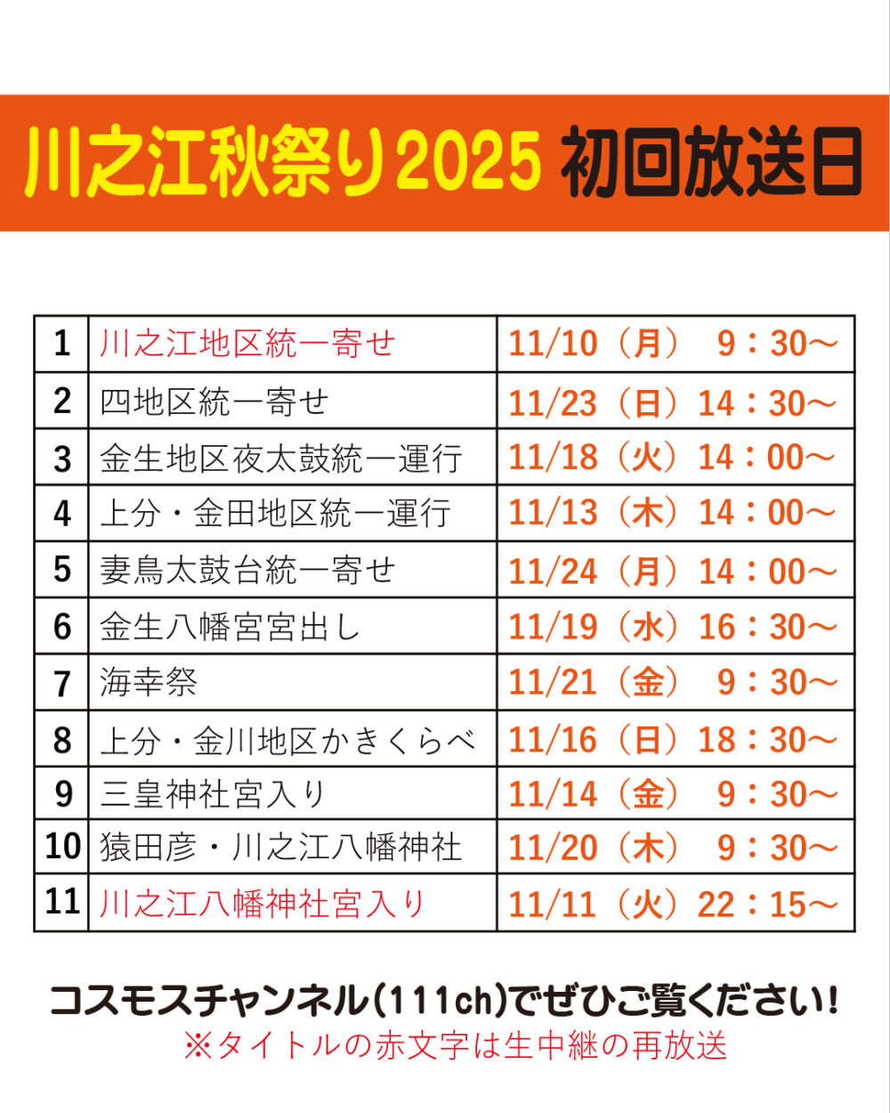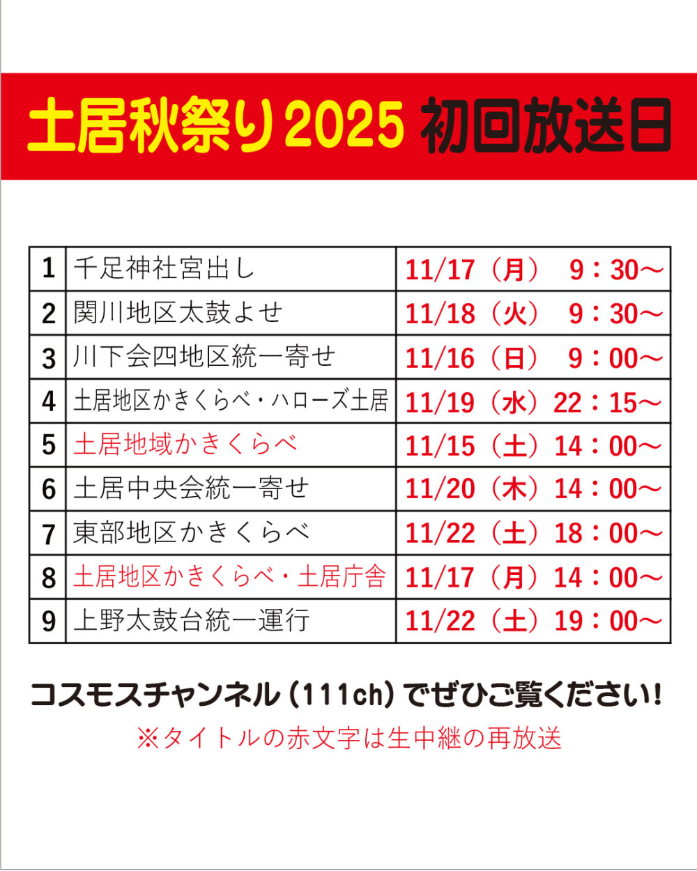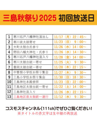 2025年度四国中央市秋祭り初回放送日決定! 2025-10-31 2025年度、“四国中央市秋祭り”初回放送日が決定致しました! 初回放送日一覧表はこちら↓ コスモスチャンネル(地上111ch)でぜひご覧ください! 111chコスモスチャンネル番組表