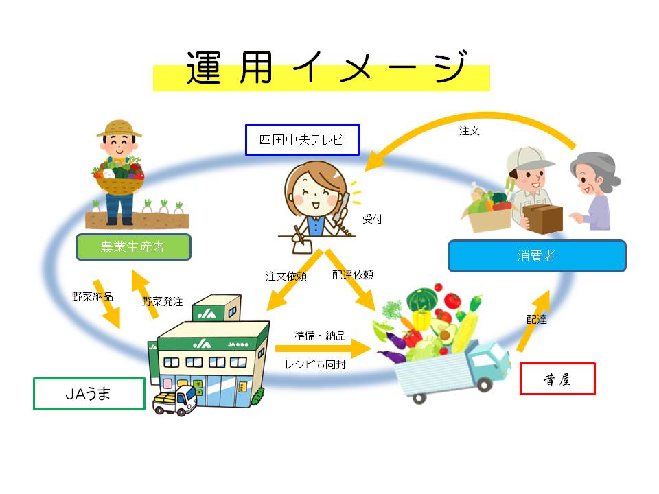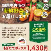 このたび、JAうまと四国中央テレビは、地産地消の推進を図るとともに、農業生産者や交通弱者(買い物難民)支援につながる取り組みとして、地元野菜宅配サービス「もぎたてボックス」を共同事業として開始いたしました。四国中央テレビが受付・お問い合わせ窓口及び課金を担当、JAうまが地元生産者から仕入れた旬な野菜を仕入れ梱包し、弁当配達サービスを行っている昔屋がご自宅等へ配達します。野菜等の種類や内容は選べませんが、季節の旬な地元の野菜を安価に購入する事が出来ます。また、ご希望の場所へ配達する事により、交通手段が無く、買い物が難しくなってきた市民のみなさんへの支援にもなります。さらに、配達する野菜を使ったレシピも同封。同時にコスモスチャンネル内で配送する野菜の調理手段を放送する事で、ご自宅での料理レパートリーが増え、食育へもつなげれるものと考えております。