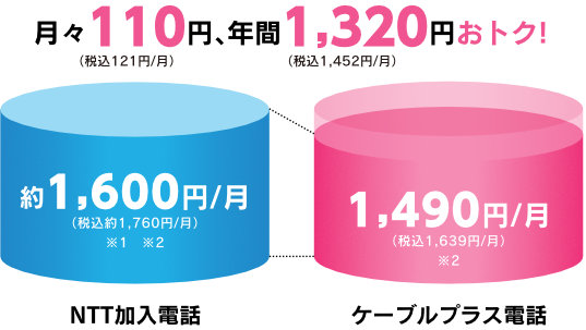 ケーブルプラス電話の月額基本料は1,490円(税込1,639円)、NTT加入電話と比べると年間1,320円(税込1,452円)おトク!